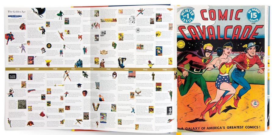 Jedes Kapitel wird mit dicken glänzenden goldenen, silbernen oder bronzenen Pappseiten eingeleitet und enthält außerdem zu jedem “Zeitalter“ noch eine Klappseite mit tabellarischer Übersicht. Zusätzlich gibt es außerdem jeweils noch unglaublich reich bebilderte Anhänge, die sich vertiefend mit einzelnen Superhelden aber auch Künstlern wie Bob Kane, Neal Adams oder Frank Miller des jeweiligen Zeitraums beschäftigen.