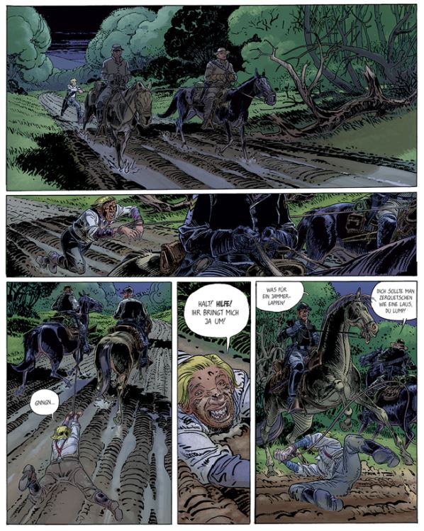 In den beiden ersten Bänden Ein Diamant fürs Jenseits und Die Gnade der Henker wird die tragisch endende Geschichte der Brüder erzählt. Schreiber & Leser startet seine neue Gesamtausgabe mit einem gebundenen Doppelband dieser beiden Abenteuer, der auch noch über einen sehr schön zusammengestellten Anhang mit Einzelillustrationen (teilweise sogar auf Klapptafeln) verfügt. Der ungewöhnliche Western lebt nicht nur von Jodorowkys deftiger Geschichte, sondern auch von Francois Boucqs Fähigkeit durch verzerrte Gesichter und ungewöhnliche Landschaftsbilder für Stimmung zu sorgen.