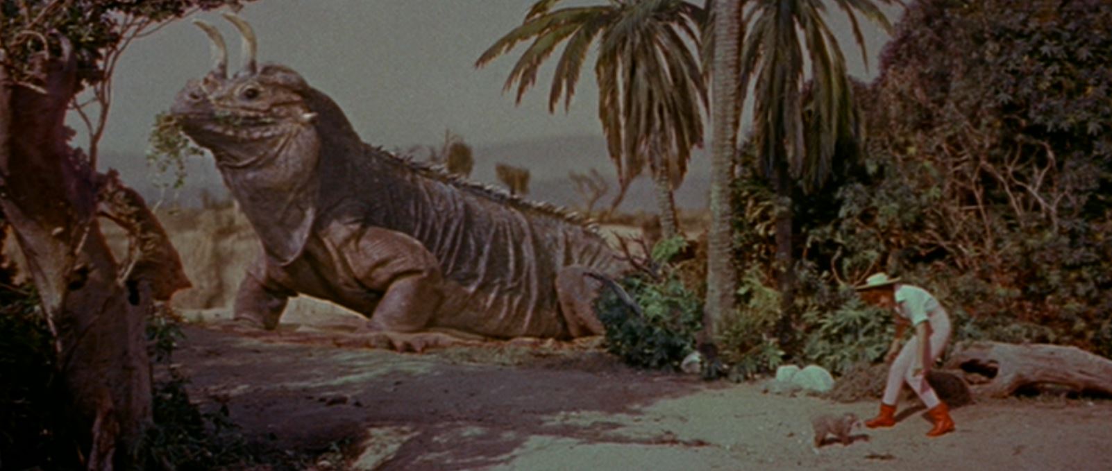 Doch was dem Film fehlt, sind glaubhafte Dinosaurier. Genau wie im 20 Jahre zuvor entstandenen Steinzeitmenschen-Klamauk Tumak, der Herr des Urwalds kommen hier ins Riesenhafte vergrößerte Eidechsen zum Einsatz. Diese wurden mit Hörnern und Knochenkämmen beklebt, in eine Felsschlucht geworfen, ertränkt und (höchstwahrscheinlich mit Hilfe von Elektroschocks) aufeinander losgelassen.