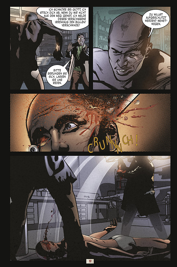 Zum Glück handelt sich hierbei nicht um “Comics zum Film“, sondern verschiedene Zeichner gestalteten neue Geschichten, die sich zwar zeitgleich zur Handlung von “28 Days Later“ ereigneten, jedoch an anderen Handlungsorten. “Phase 1“ erzählt die Vorgeschichte, danach wird gezeigt wie es zu den ersten Opfern der Epidemie kam, anschließend bekämpft ein einsamer Überlebender in London die Infizierten und zum Abschluss gibt es in “Phase 4“ noch eine Rachestory.