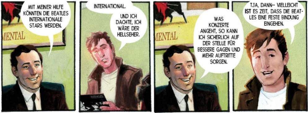 Über einen Mangel an Beatles-Comics kann nicht geklagt werden. Meistens werden interessante Einzelaspekte aus der Geschichte der Fab Four thematisiert. Arne Bellstorf beschäftigt sich inBaby’s in Black mit der Liebesgeschichte zwischen Astrid Kirchherr und Stuart Sutcliffe. Den mehr oder weniger erfolgreichen Beatles-Manager Brian Epstein und Allan Williams wurden eigene Comics gewidmet, während Klaus Voormann himself erzählte, wie sein Cover zu Revolver entstanden ist.