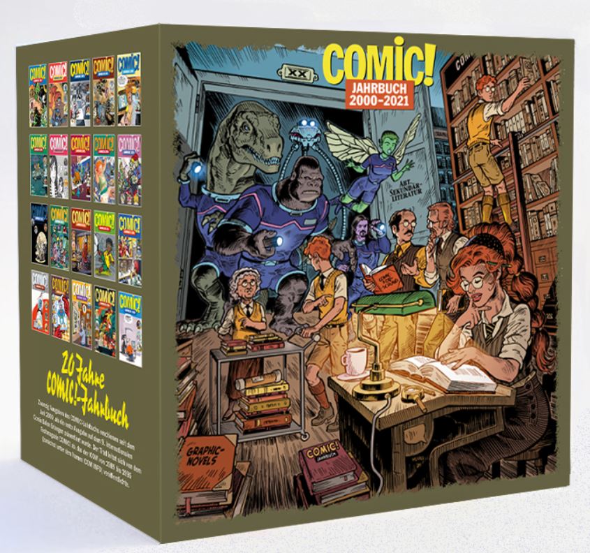 Als Ausgleich hat der ICOM zu seinem 40-jährigen Jubiläum einen Komplettschuber mit allen bisher erschienenen COMIC!-Jahrbüchern produziert. Das gute Stück ist auf 40 nummerierte Exemplare limitiert, die von Martin Frei signiert wurden, vom auch das schöne Backcover stammt. Die 21 Jahrbücher mit Schuber können hier zum “Jubiläumspreis“ von 111,- Euro bestellt werden.