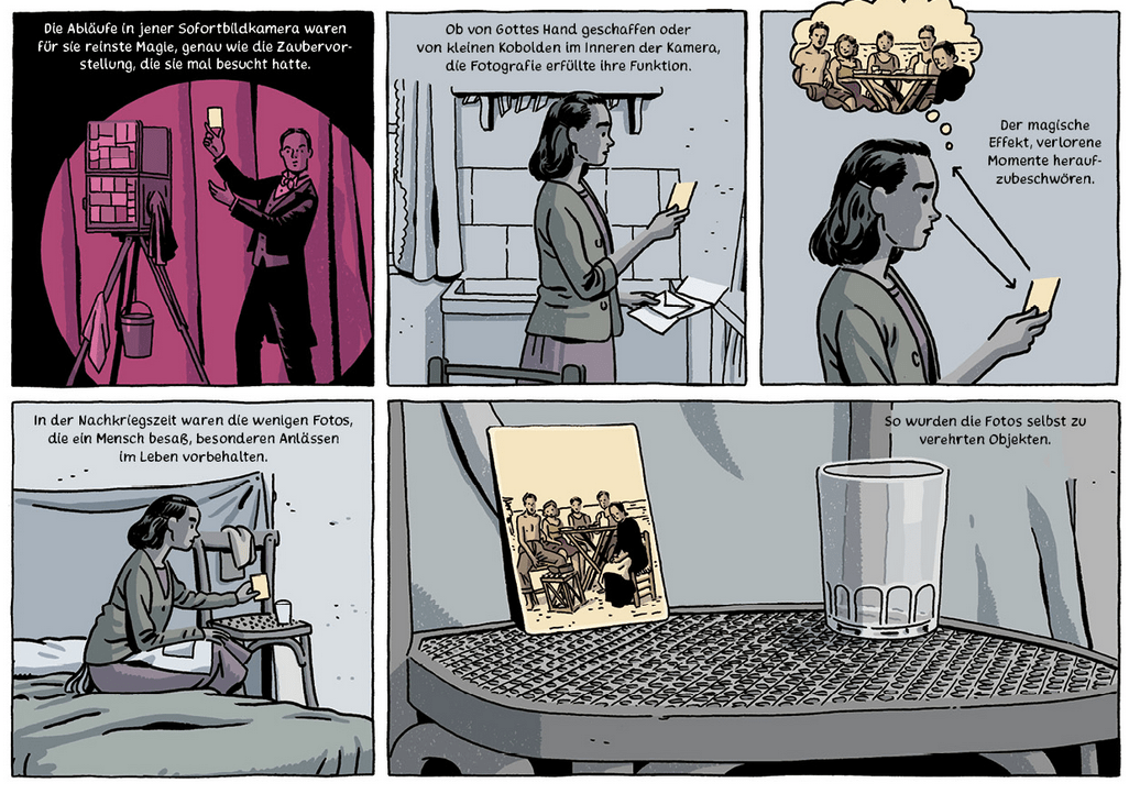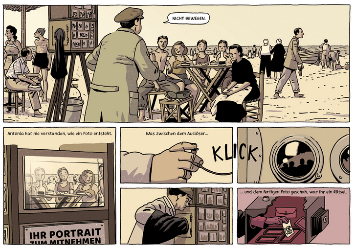 Das Titelbild des Comics zeigt das Zustandekommen jenes Fotos aus der Sicht von Antonia, noch ist der Hocker frei, auf den sie gleich Platz nehmen wird. Das Foto, das sie als junges Mädchen zeigt, wird Antonia ihr Leben lang begleiten. Für sie ist es “wie ein Stück Bernstein, das eine prähistorische Mücke in sich barg, ein wertvolles Überbleibsel der Vergangenheit.“ Daher ist es nicht verwunderlich, dass Antonia als alte Frau schwer frustriert war, als das Foto für eine Weile abhandengekommen war.