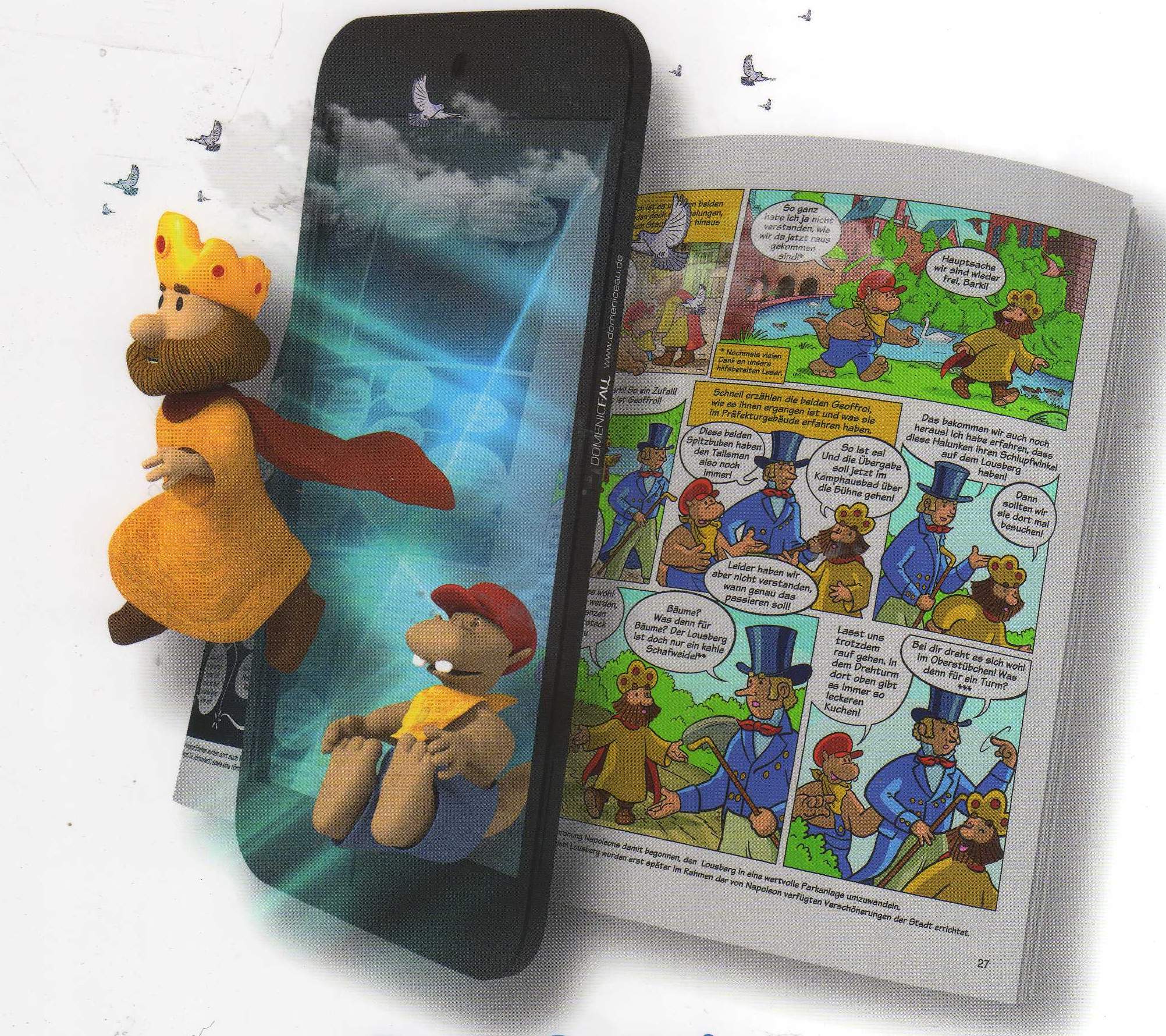 So landete Karl der Kleine bereits in der Klimahölle und musste sich damit auseinandersetzen, dass sein Kumpel, der Wassergott Granus, nicht mehr ausschließlich männlich sein wollte und sich daher Grannini nannte. In seinem siebten Comicalbum Doppelt gemoppelt ist zwar auch allerlei Interessantes über Julius Reuter zu erfahren, der durch den Einsatz von Brieftauben ab 1850 von Aachen aus den internationalen Journalismus reformierte.