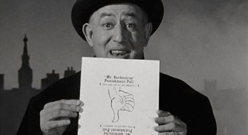 Castle hatte in den Kinos an die Zuschauer vor Beginn der Vorstellung kleine Karten verteilen lassen. Bedruckt waren diese mit einer im Dunkeln leuchtende Hand, deren Daumen – je nachdem wie herum das Kärtchen gehalten wurde – nach oben oder nach unten zeigte. Castle forderte die Zuschauer auf – wie im Alten Rom – zu entscheiden, ob der Übeltäter bestraft werden sollte oder unbehelligt davonkommt. William Castle auf der Leinwand tat dann so, als wenn er die “Daumen hoch“- und “Daumen runter“-Stimmen zählte und ließ dann den Filmvorführer das “böse Ende“ starten. Da er seine Pappenheimer kannte, hatte er es nicht für nötig gehalten, ein Happy End für den Schurken zu drehen.