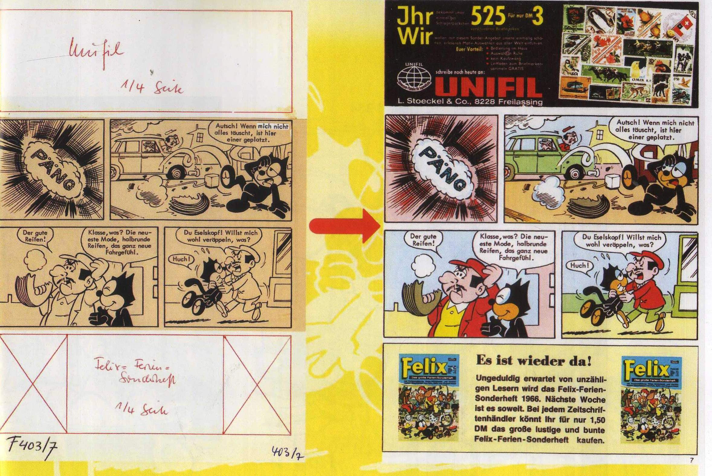 Ein wichtiges Thema ist natürlich auch der erstmals 1919 im Trickfilm aufgetretene Kater Felix the Cat. Dieser war auch der Namens-Pate des Hefts Felix, mit dem der Bastei Verlag zusammen mit der Zeitschrift Pony (hierin erschien u. a. auch Tim und Struppi) 1958 seine Comic-Produktion aufnahm.