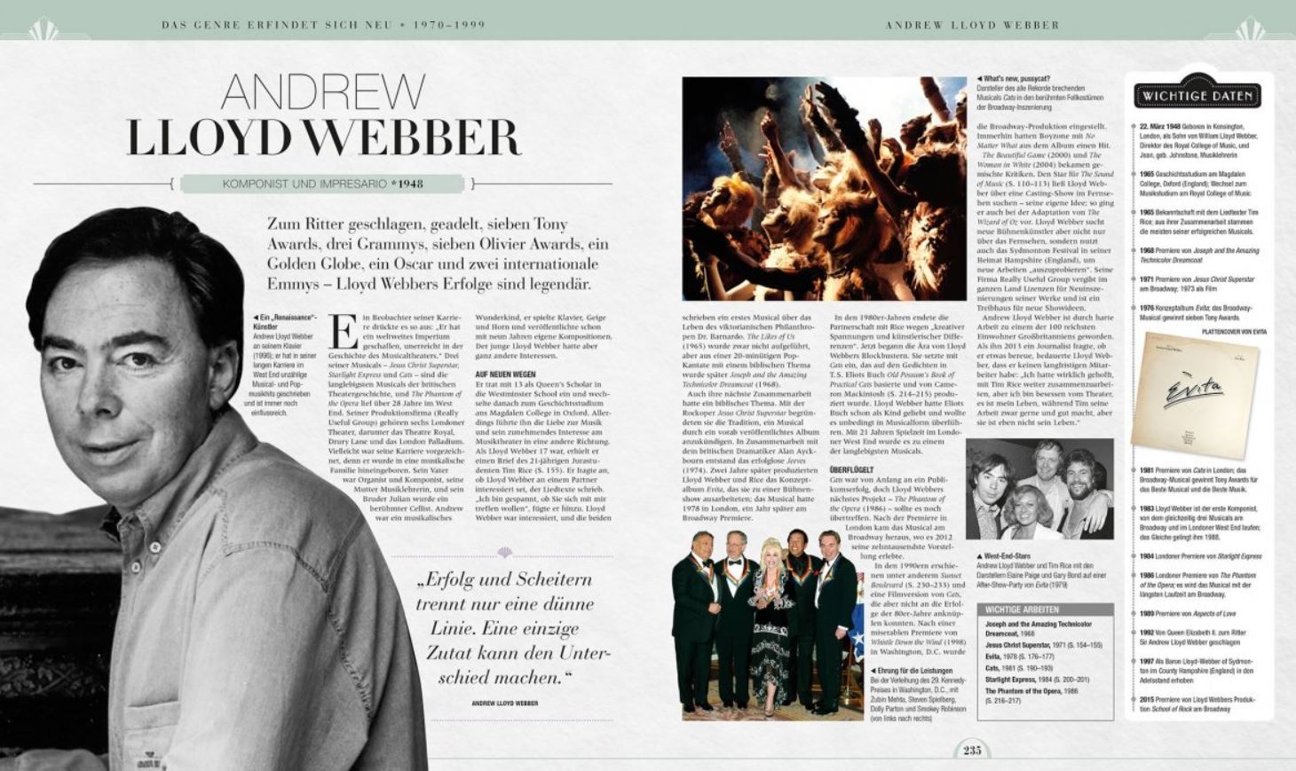 Außerdem gibt es noch Biographien zu Persönlichkeiten wie George und Ira Gershwin, Fred Astaire, Irving Berlin, Cole Porter, Andrew Lloyd Webber, Julie Taymor oder Elton John. Leider sind die von mehreren Autoren verfassten Texte oft etwas trocken und nur selten so amüsant wie im Falle der Beschreibung von Mamma Mia!. Hier wird auch eine Kritik zum zugehörigen Film zitiert, in der es heißt, dass man: “so schnell nicht wieder hautnah erleben kann, wie erstklassige Schauspieler betrunken Karaoke singen.“