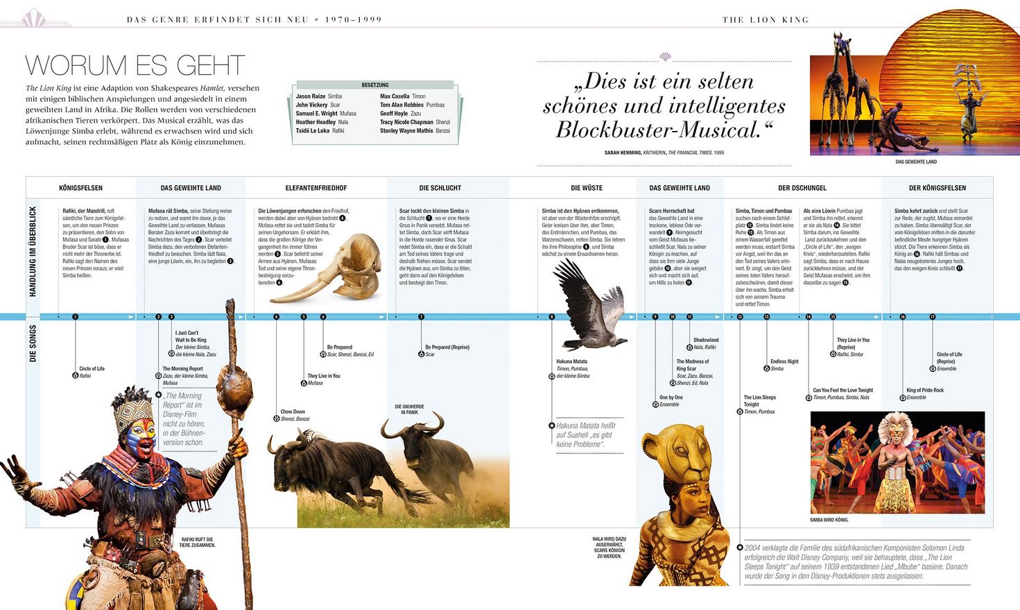 Dabei geht es um Bühnen- wie auch um Film-Musicals. Ein Anhang bietet noch Kurzinfos zu weiteren Musicals. Besonders interessant sind die Doppelseiten auf denen die Strukturen einzelner Musicals übersichtlich dargestellt werden. Hier ist zu sehen, wie die Handlung verläuft und wann die einzelnen Songs zum Einsatz kommen.