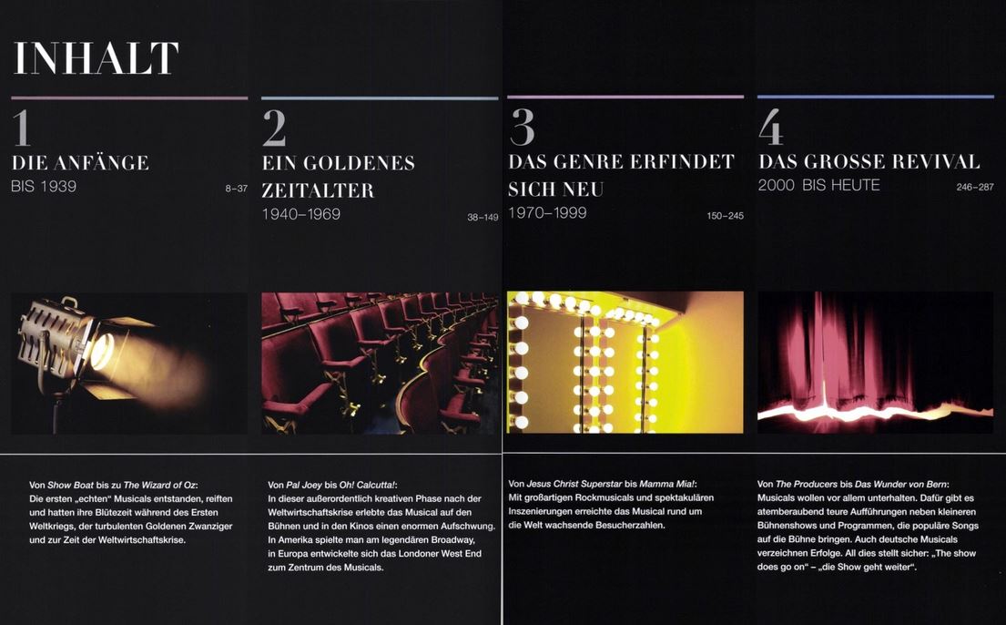 Das Buch beschreibt chronologisch geordnet bis hinein in die Gegenwart die erfolg- und einflussreichsten Musicals wie Porgy und Bess, The Wizard of Oz, Singin‘ in the Rain, My Fair Lady, West Side Story, Mary Poppins, Hair, The Rocky Horror Picture Show, Cats, Billy Elliot, Mathilda, aber auch Die Drei-Groschen-Oper findet Berücksichtigung.